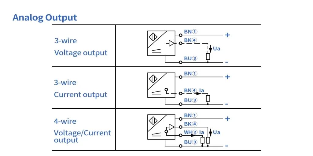 Most modern analog sensors use standard M12 connectors or 3-wire cable tails.